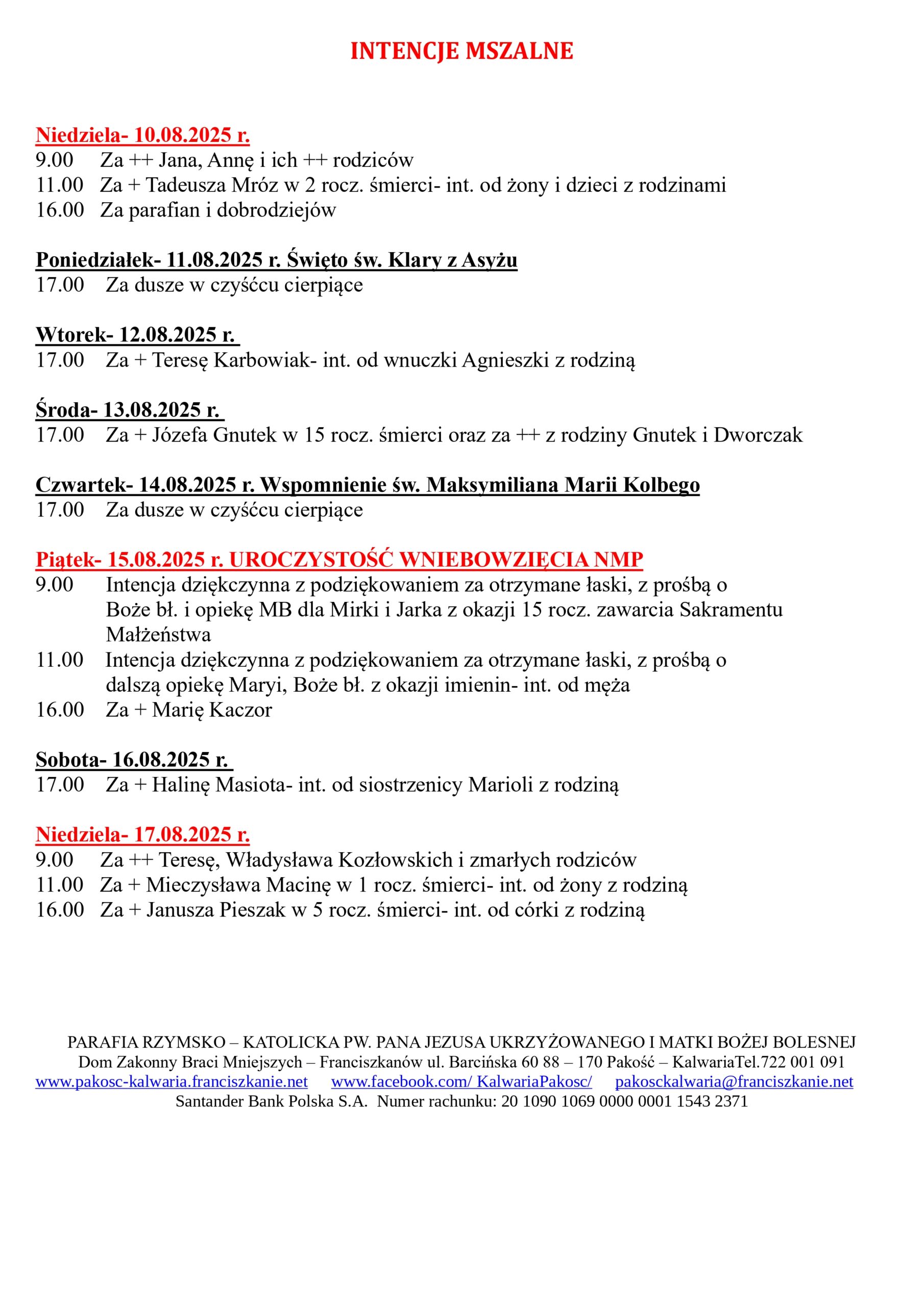 INTENCJE MSZALNE 10.08.-17.08.2025r.