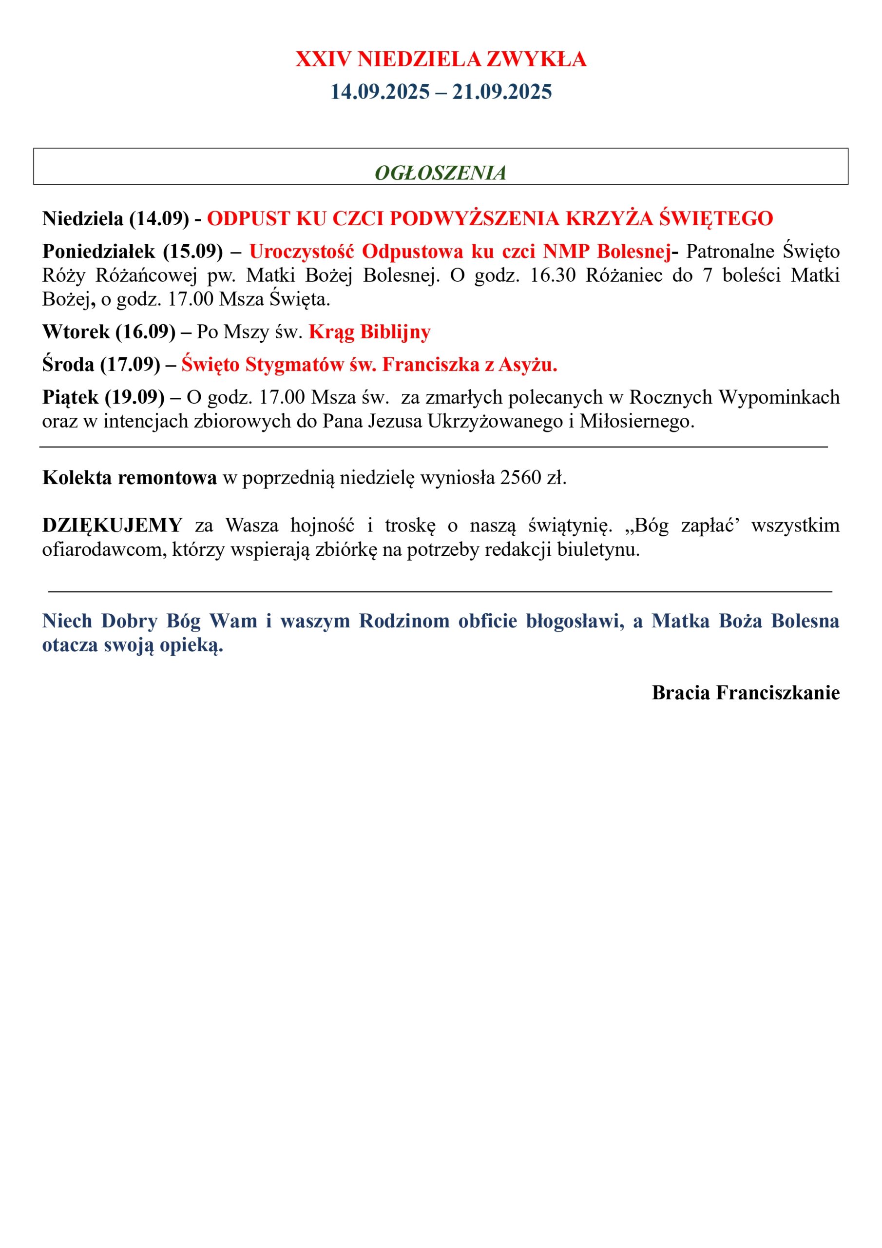XXIV NIEDZIELA ZWYKŁA  14.09. - 21.09.2025r.