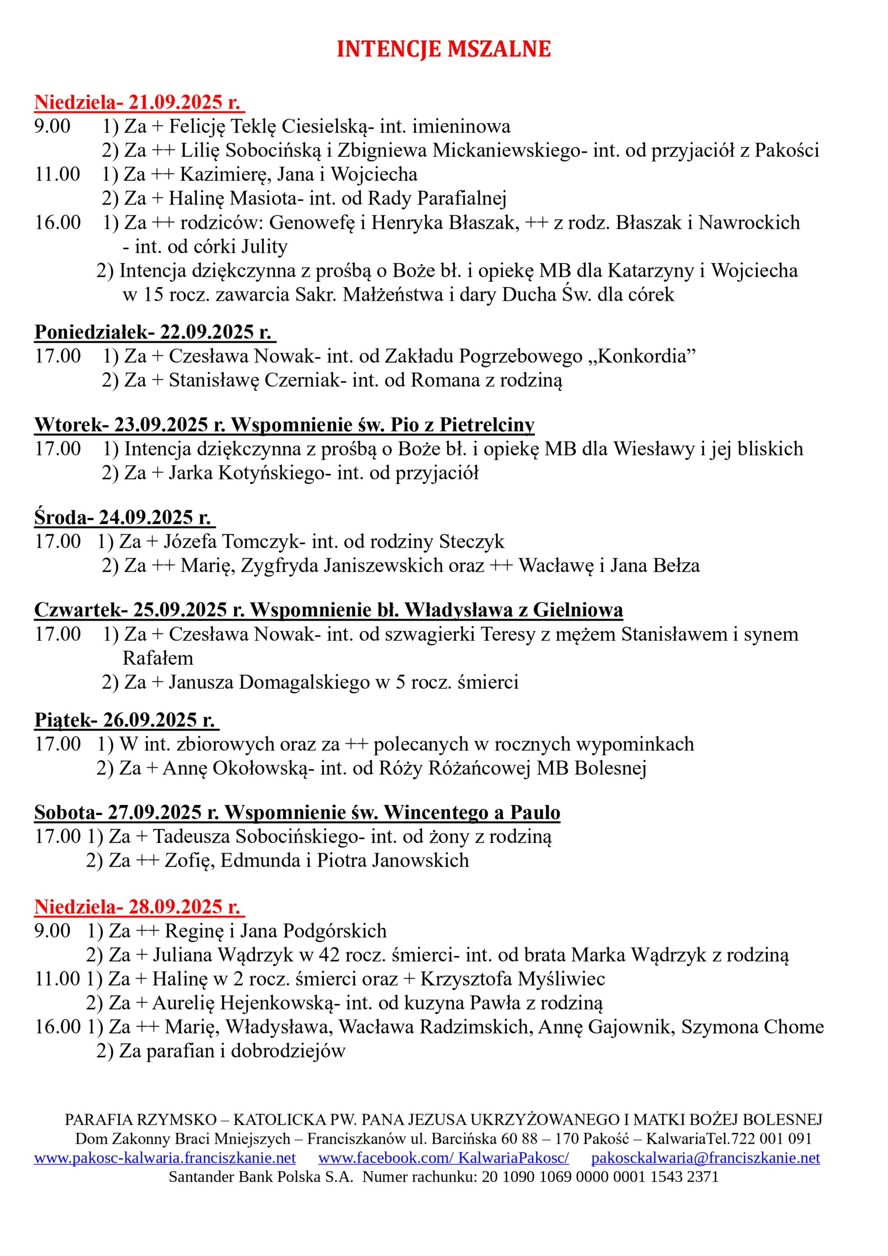 INTENCJE MSZALNE 21.09. - 28.09.2025r.