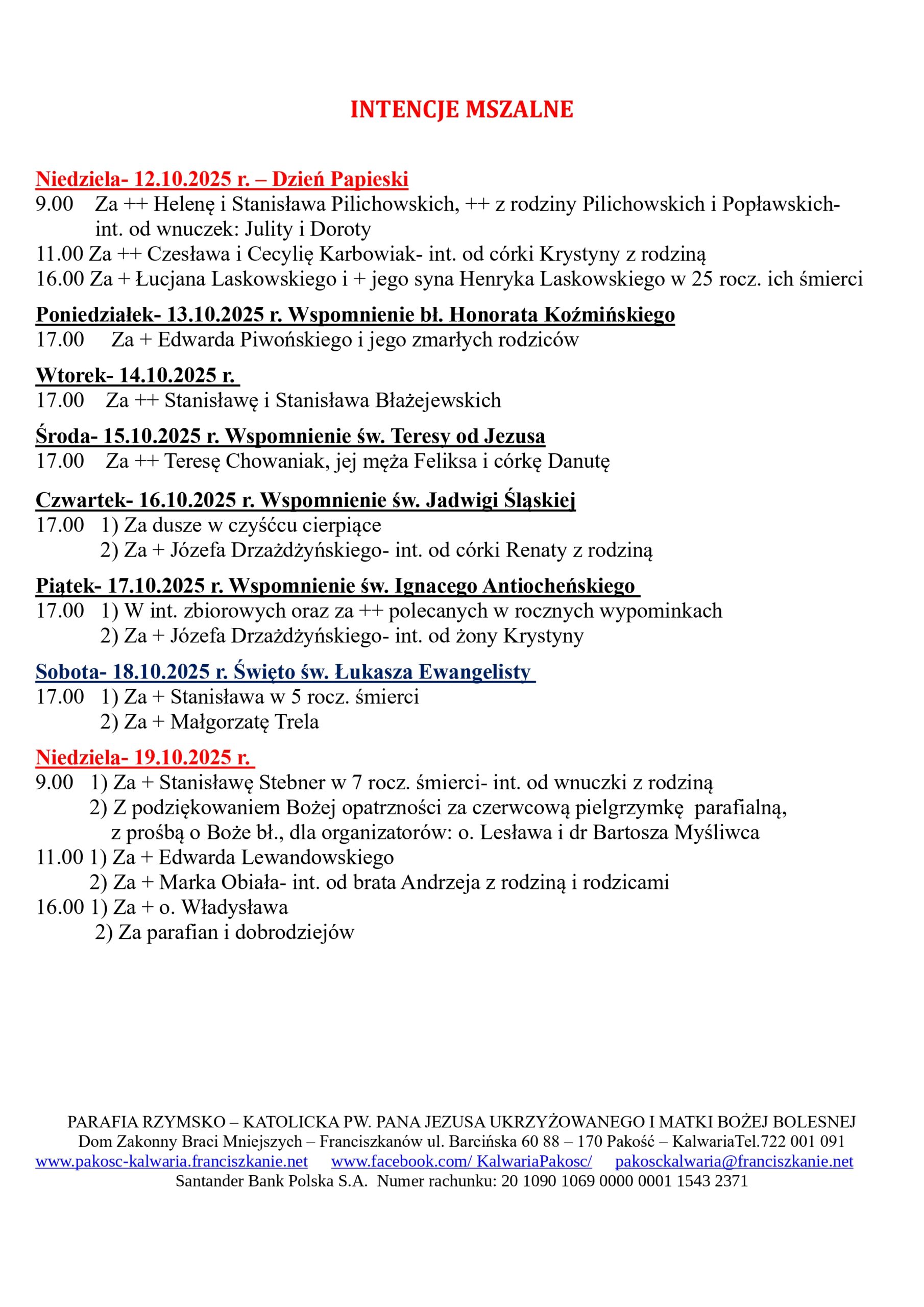 • INTENCJE MSZALNE 12.10.-19.10.2025r. 15 października 2025