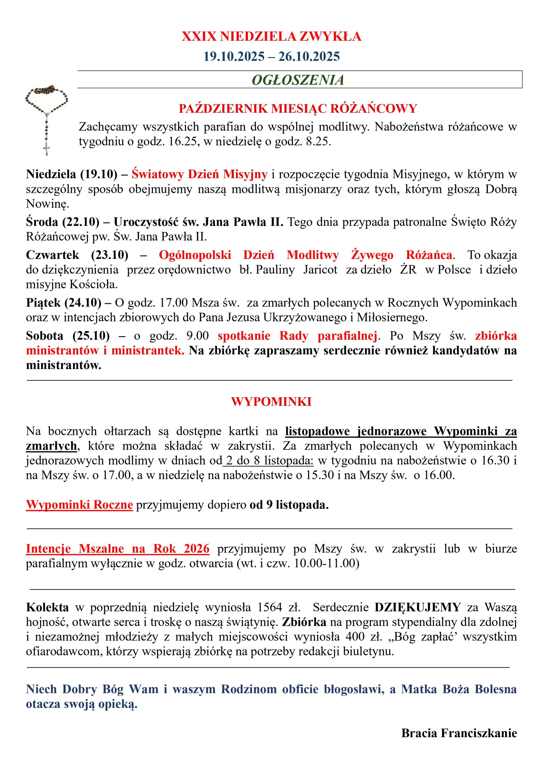 XXIX NIEDZIELA ZWYKŁA 19.10.-26.10.2025r.