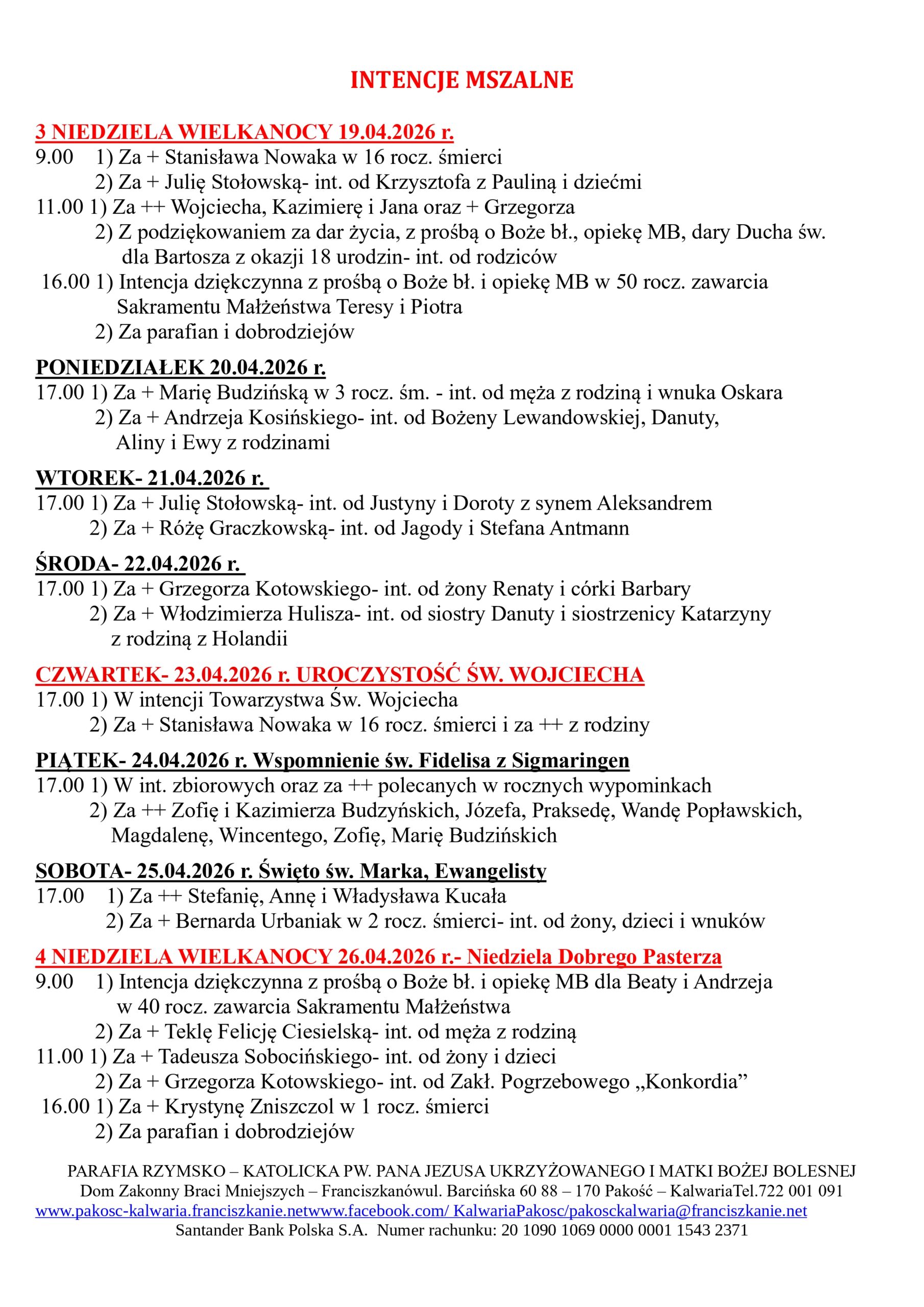 INTENCJE MSZALNE 19.04. - 26.04.2026r.